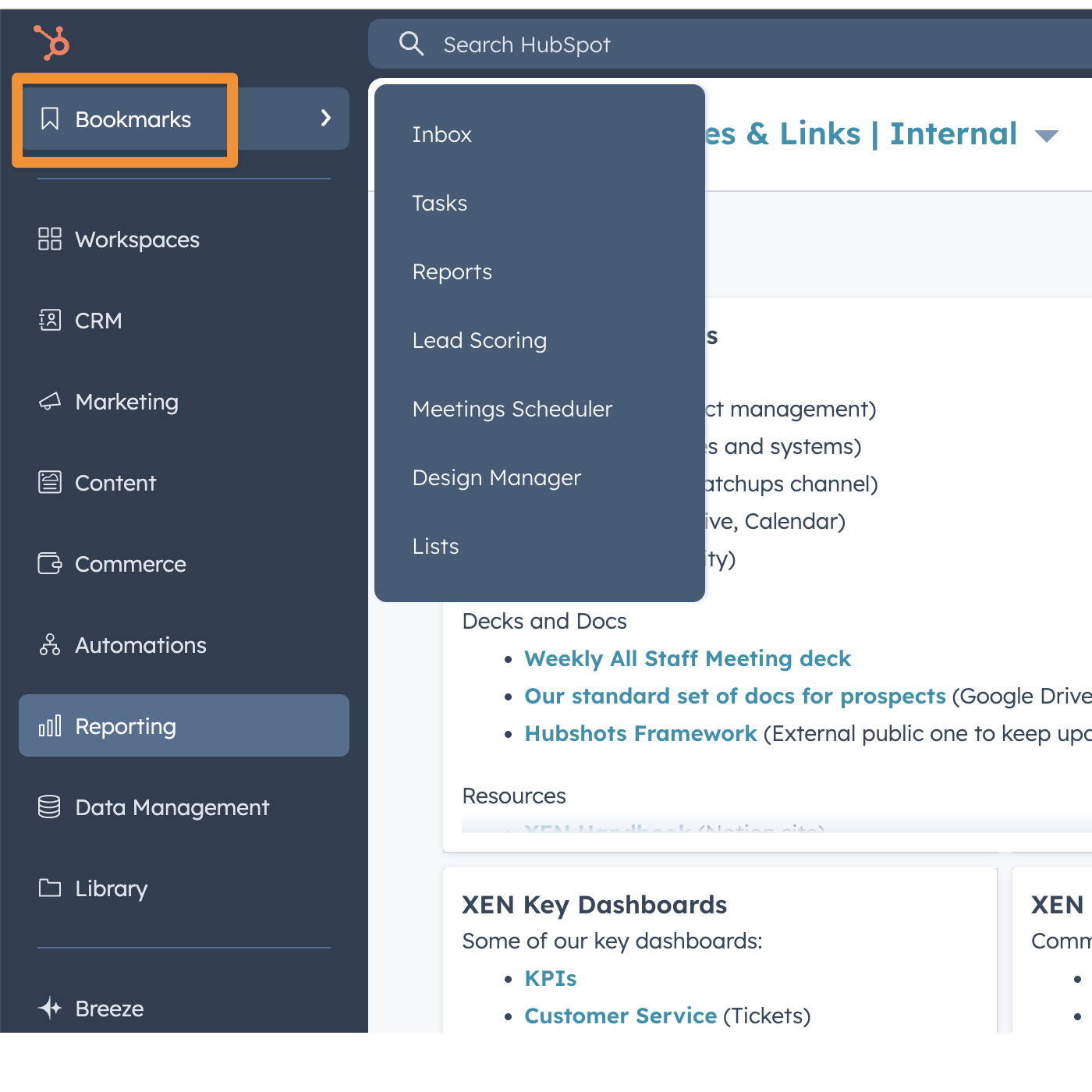 For some, the Bookmarks feature in HubSpot is for favourites, for others it's for 'where the hell are they are again?' links
