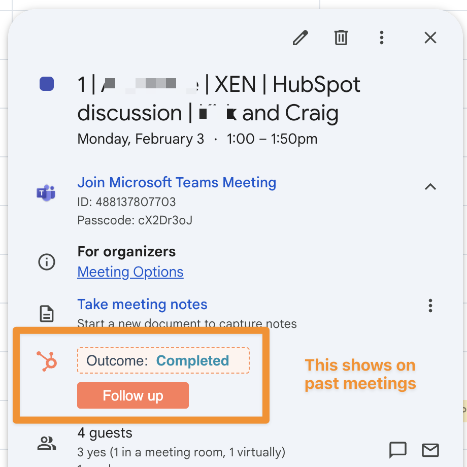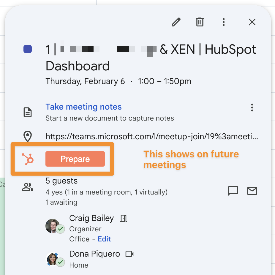 - Future meetings: a Prepare button (which opens up in HubSpot with details)