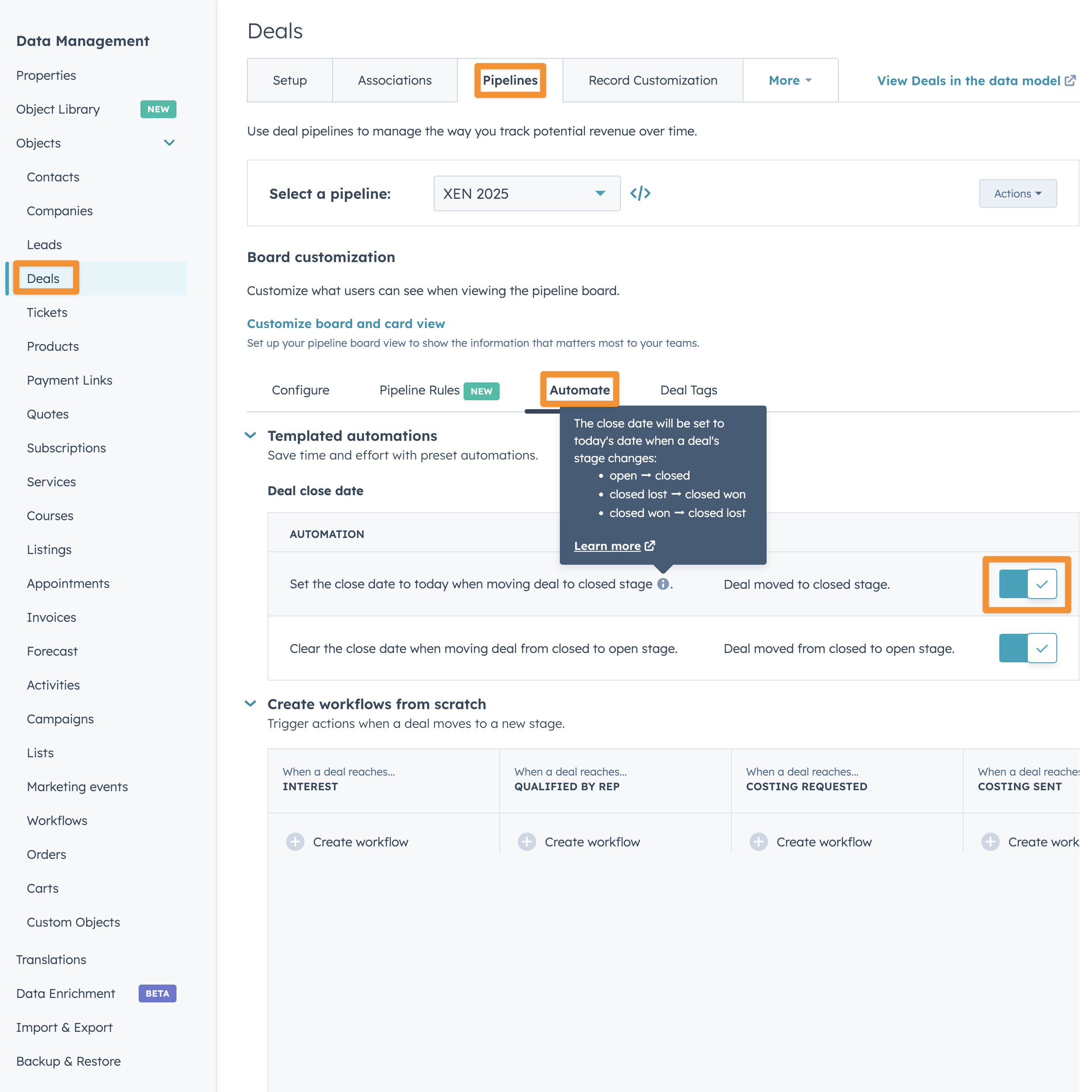 Updating the Close date automatically on a HubSpot deal when the deal closes (either Won or Lost) is usually a handy timesaver, and you'd typically keep this on.