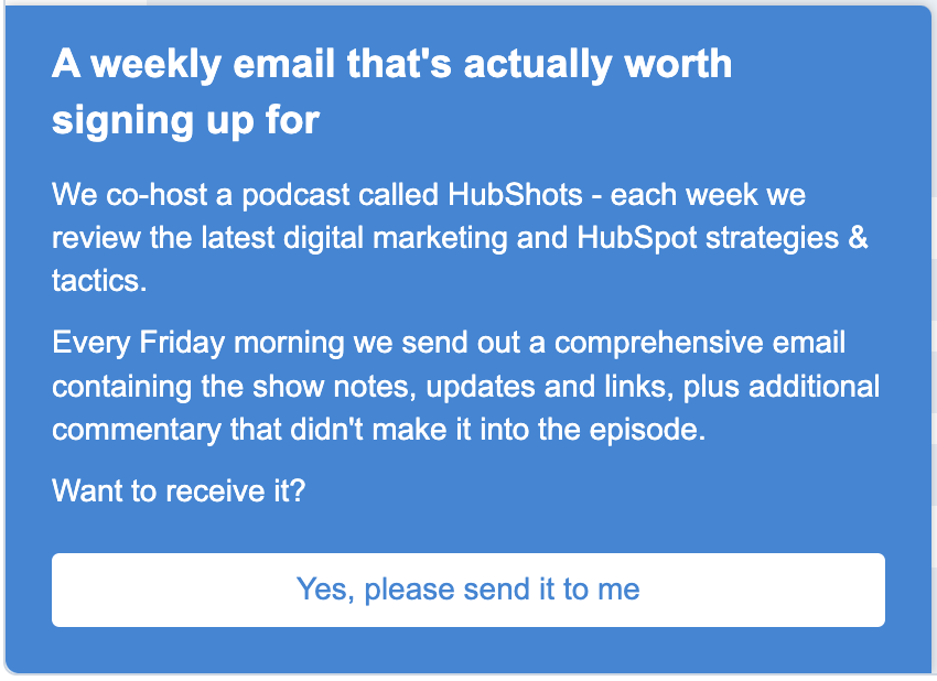 One potentially confusing (but super handy) option with HubSpot forms is to create forms that don’t actually have any fields to be submitted. Some would say that means it isn’t actually a form (and I get that) but put that aside for now.